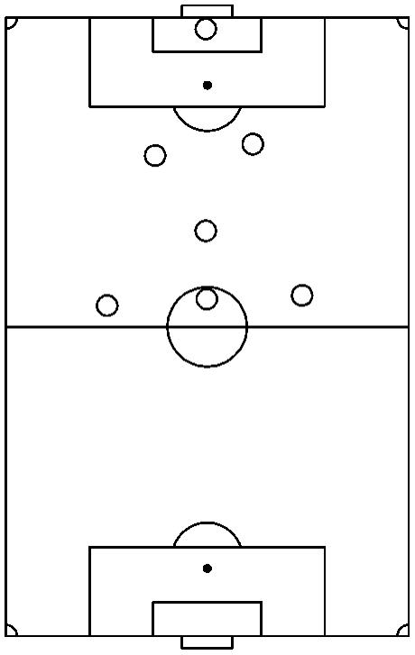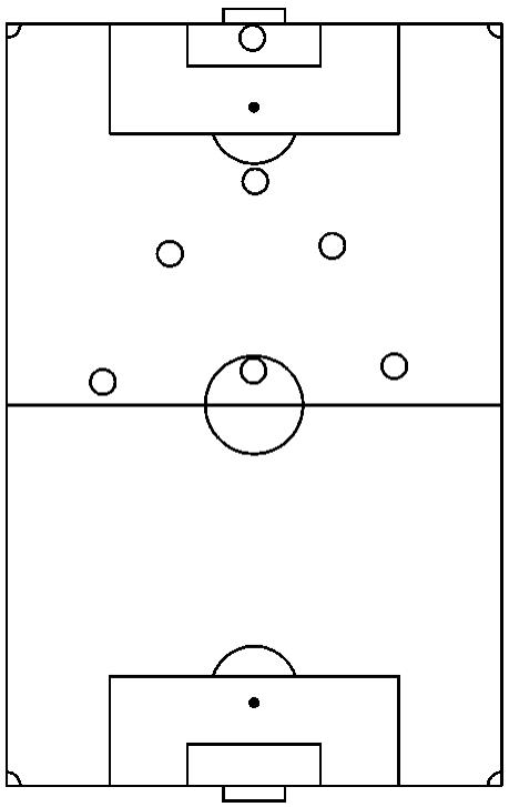 另外,也有一些水平高、体力好的队采用固定1人为后卫、1人为中锋,其他4人机动跑位,攻守为5攻5守的踢法。这种踢法要求4个机动跑位的队员技术全面,战术素质高。