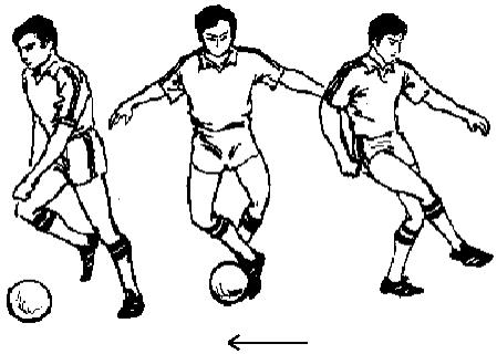 传球前的踢球假动作:预备传球时,如对手迎面跑来抢球,可先做假踢动作,诱使对手堵截传球路线,然后改变方向传球(图2-44)。
