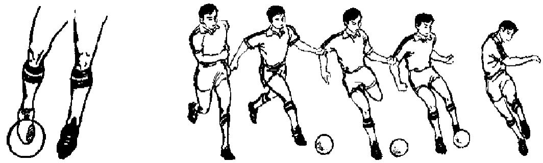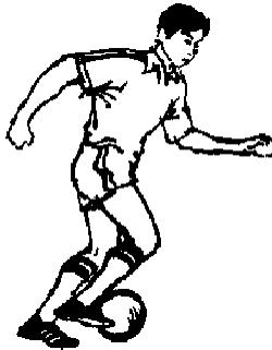2)脚背正面踢球分为用脚背正面踢定位球、空中球、反弹球及倒勾球等。下面介绍一种基本的脚背正面踢定位球技术。