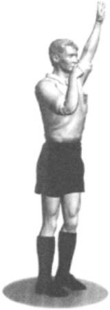 3)角球——单臂斜上举,指向罚角球的角球区方向。