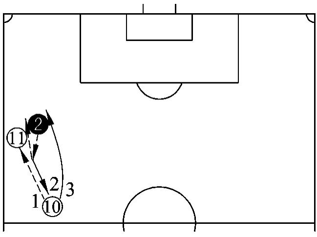 2)回传反切二过一(图2-51):⑩号回撤迎球,❷号紧逼,⑩号回传给⑪号并转身反切接⑪传至❷号身后空当的球。