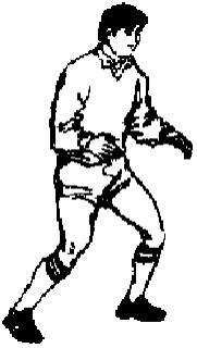 挺胸停球:面对下落的球,收下颚,两臂自然张开,两脚前后开立,重心落于两脚之间,两膝微屈。当球运行至胸部接触前的一刹那,挺胸收腹。胸部接触球时,上体稍后仰挺胸,使球弹起改变运行路线后落于体前(图2-38)。