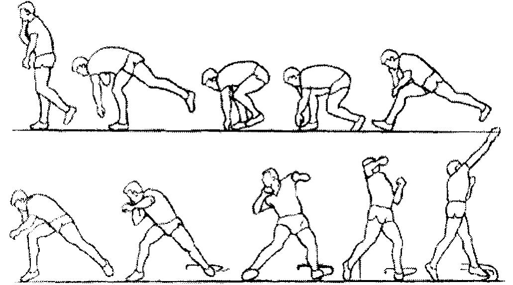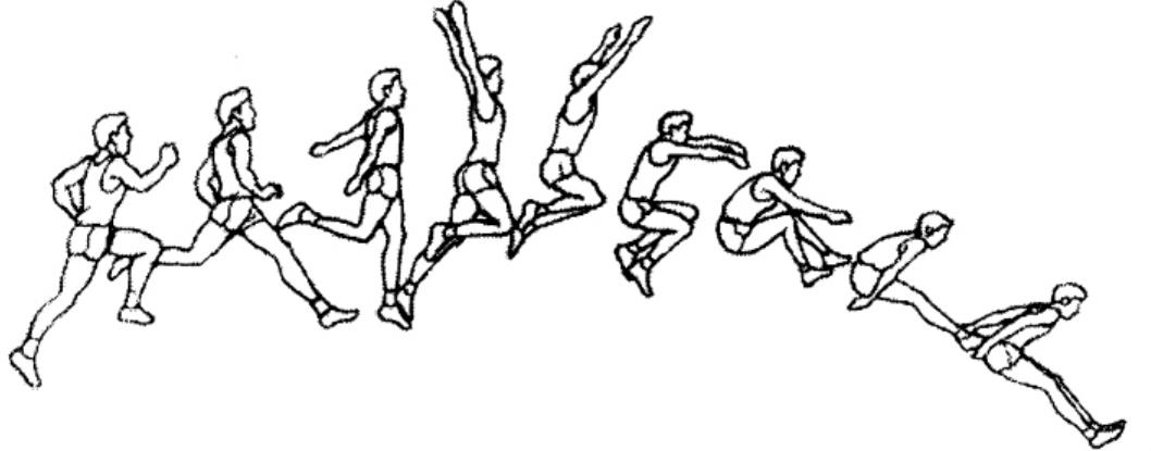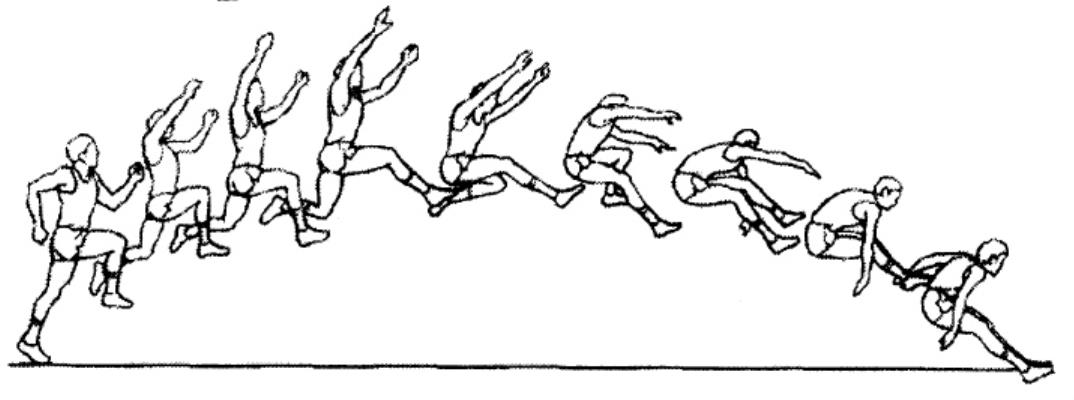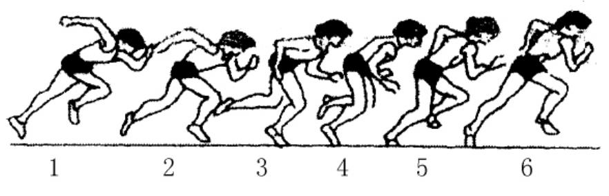 3)途中跑。途中跑的任务是继续发挥和保持最高跑速。跑是周期性的运动,在跑的一个周期中,单步由后蹬和前摆、腾空、着地和缓冲几个部分组成(图3-4)。