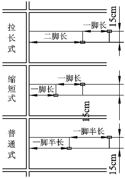 1)起跑。起跑的任务是使身体迅速摆脱静止状态,为起跑后的加速跑创造条件。田径规则规定,短跑比赛中运动员必须采用蹲踞式起跑,必须使用起跑器,运动员要按发令员的口令完成起跑动作。起跑器的安装方式有普通式、拉长式和缩短式3种,如图3-1所示。运动员采用哪种方式应根据个人的身高、体形、身体素质和技术水平等情况来选择,其目的是使运动员能充分发挥肌肉的最大力量,获取最大初速度,有助于加速跑的完成。起跑包括“各就位”“预备”和“鸣枪”3个阶段。