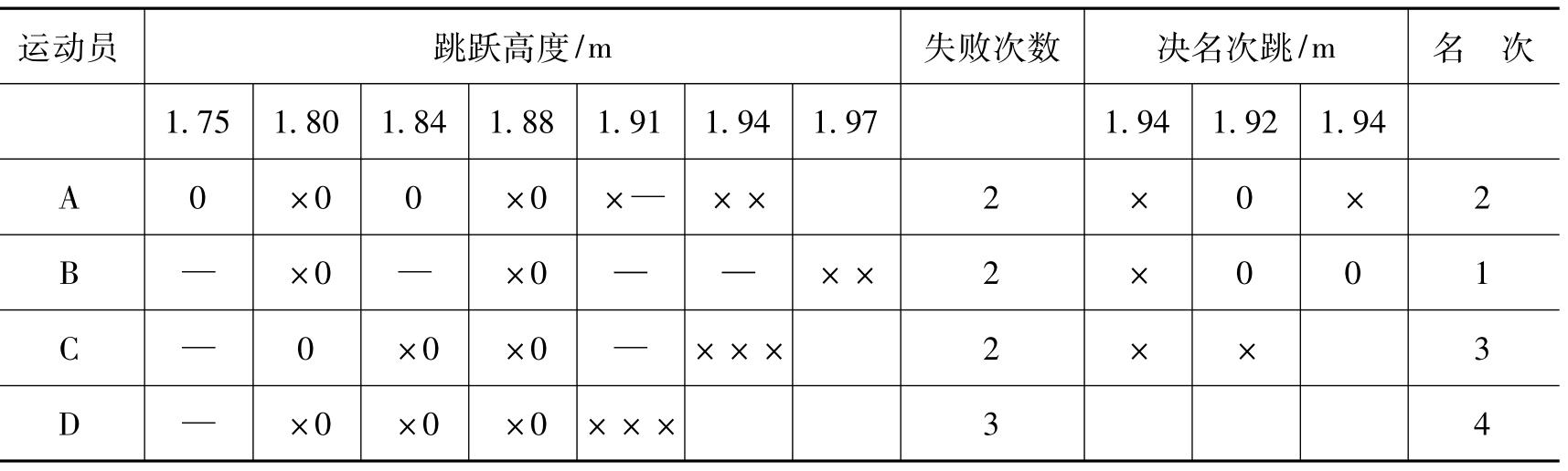 田赛高度项目的名次判定与成绩相等时的处理方法:每名运动员应以其最好的一次试跳成绩,包括因第一名成绩相等而进行的决名次赛的试跳成绩,作为其最后的决定成绩,然后以个人最好成绩排列名次。