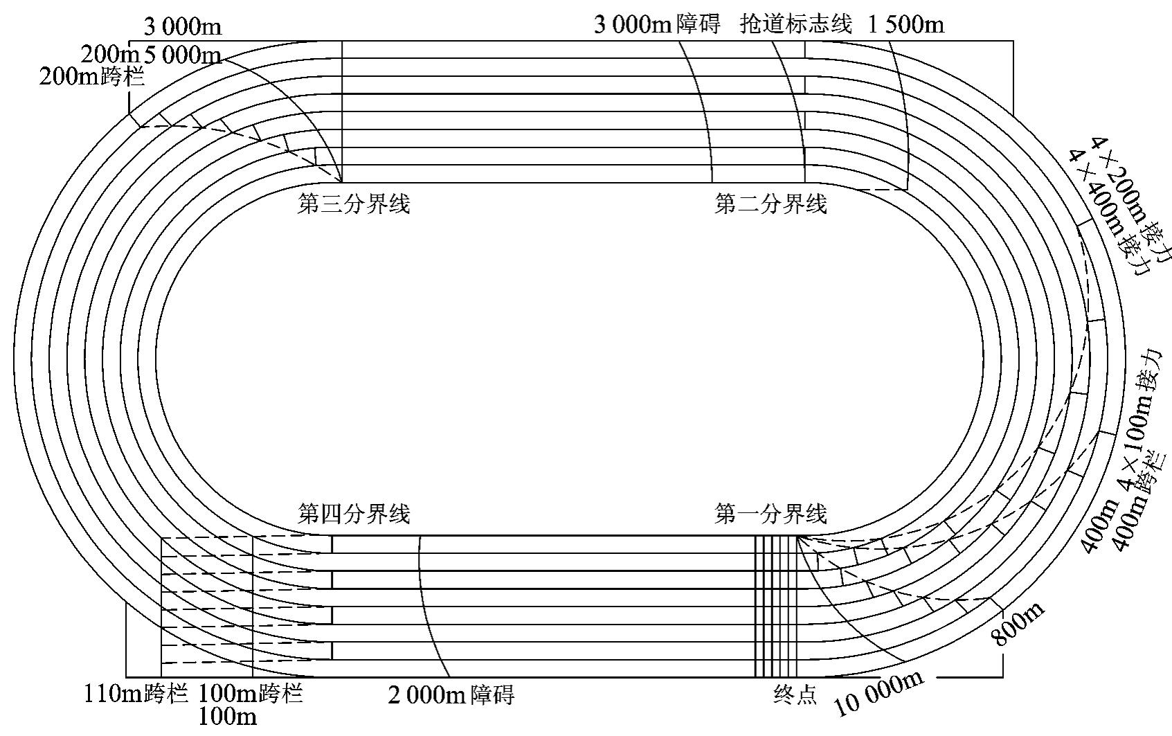 标准半圆式400m田径场的跑道是由两个180°的半圆(弯道)和两个直段组成,如图3-15所示。