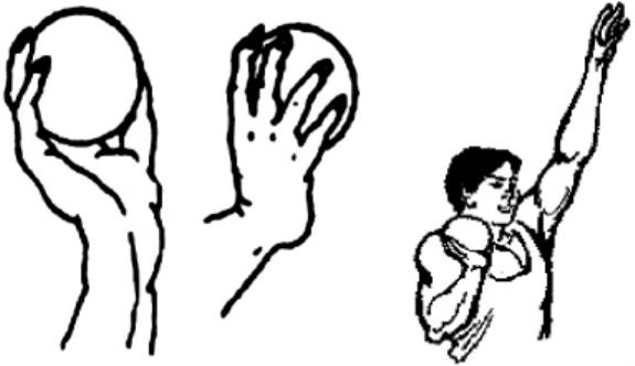 1)握持铅球(图3-13)。①握球(以右手投掷为例)。五指自然分开,将球放在食、中、无名指根处,拇指和小指扶在球的两侧,手腕背屈。②持球。握好球后将球放在锁骨窝处,贴于颈部,下颌向右转,右臂屈肘,掌心向内,上臂与肩齐平或略低于肩,左臂自然上举,两眼平视前方。