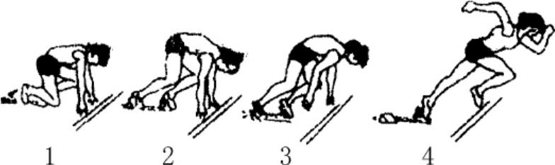 如图3-2所示,听到“各就位”口令后,运动员轻快地走到起跑器前,俯身两手撑地,两脚依次蹬在前、后起跑器的抵足板上,后膝跪地,通常将有力腿放在前起跑器上,接着两臂收回到起跑线后支撑地面,两臂伸直,两手间距离与肩同宽或比肩稍宽,四指并拢与拇指分开成八字形支撑,身体重心稍前移,肩约与起跑线齐平,头与躯干保持在一条直线上,颈部自然放松,身体重量均匀地落在两手、两腿和后膝之间,注意听“预备”口令。