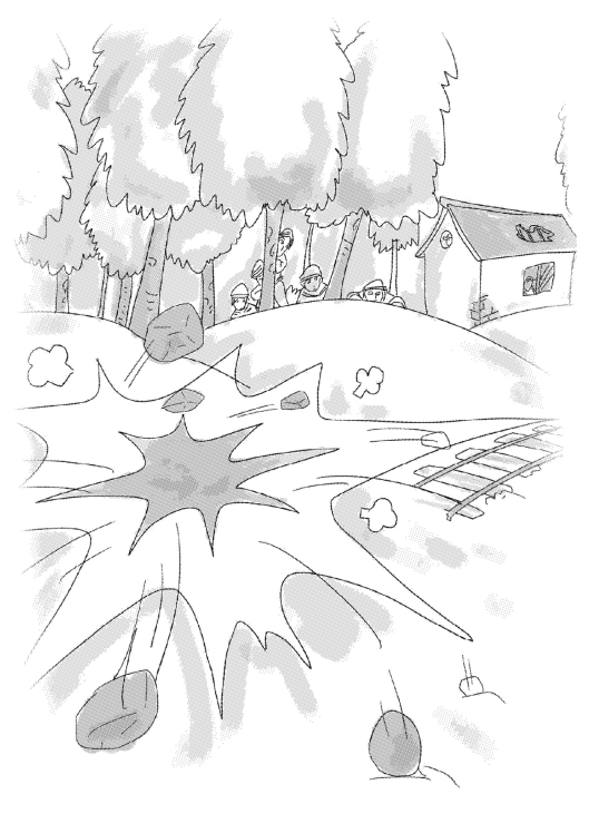 第二天一早,一列装甲车隆隆作响,开进了车站。从装甲车厢里走出几个穿皮大衣的人。几小时后,装甲车送来的三名爆破手,在斜坡上深深地埋下两个深蓝色的大南瓜,接上长长的导火线,然后便放了信号弹。人们纷纷远离小山包,四下隐蔽。火柴触到了导火线,磷光一闪。人们紧张地等待着。终于,两声震耳欲聋的爆炸声回荡开来。