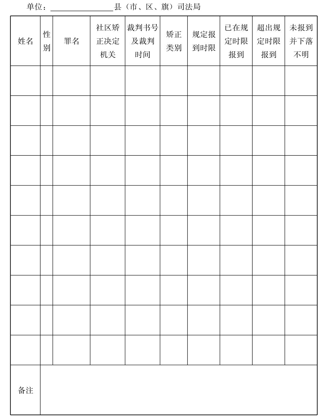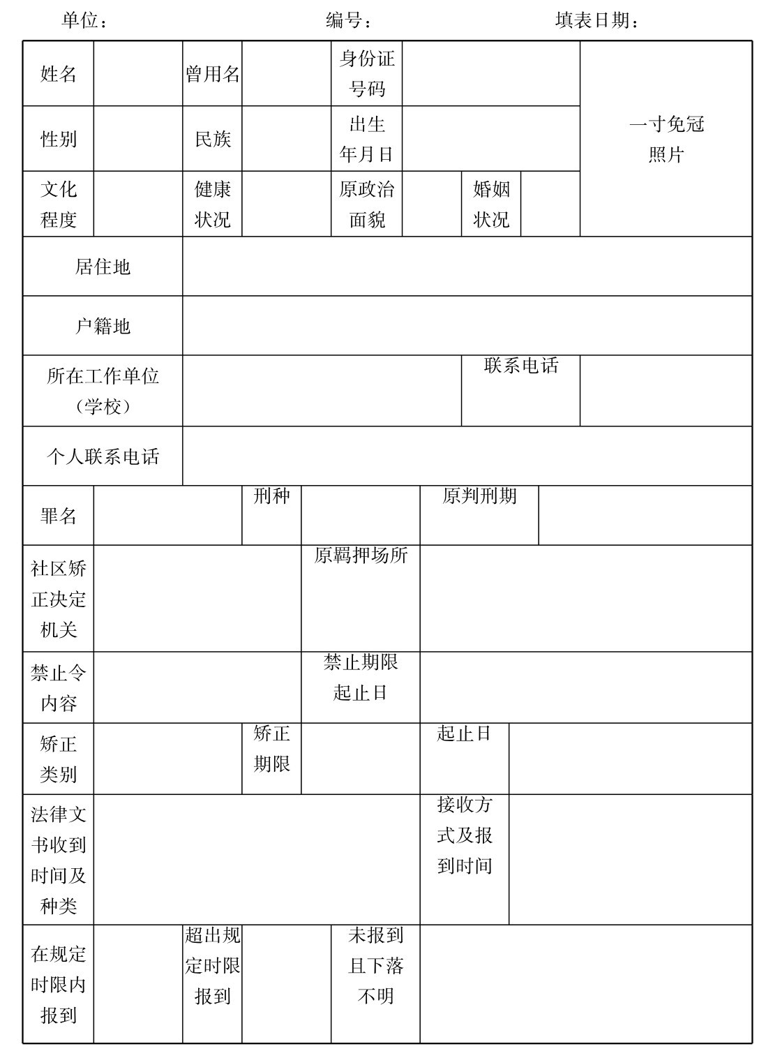 根据 《实施办法》第五条、第六条内容设计。此表由县级司法行政机关在社区矫正人员报到时填写,一式三份,县级司法行政机关、司法所各存档一份,抄送居住地公安机关一份。社区矫正人员居住地变更后,新居住地县级司法行政机关应重新填写此表,并抄送新居住地公安机关。