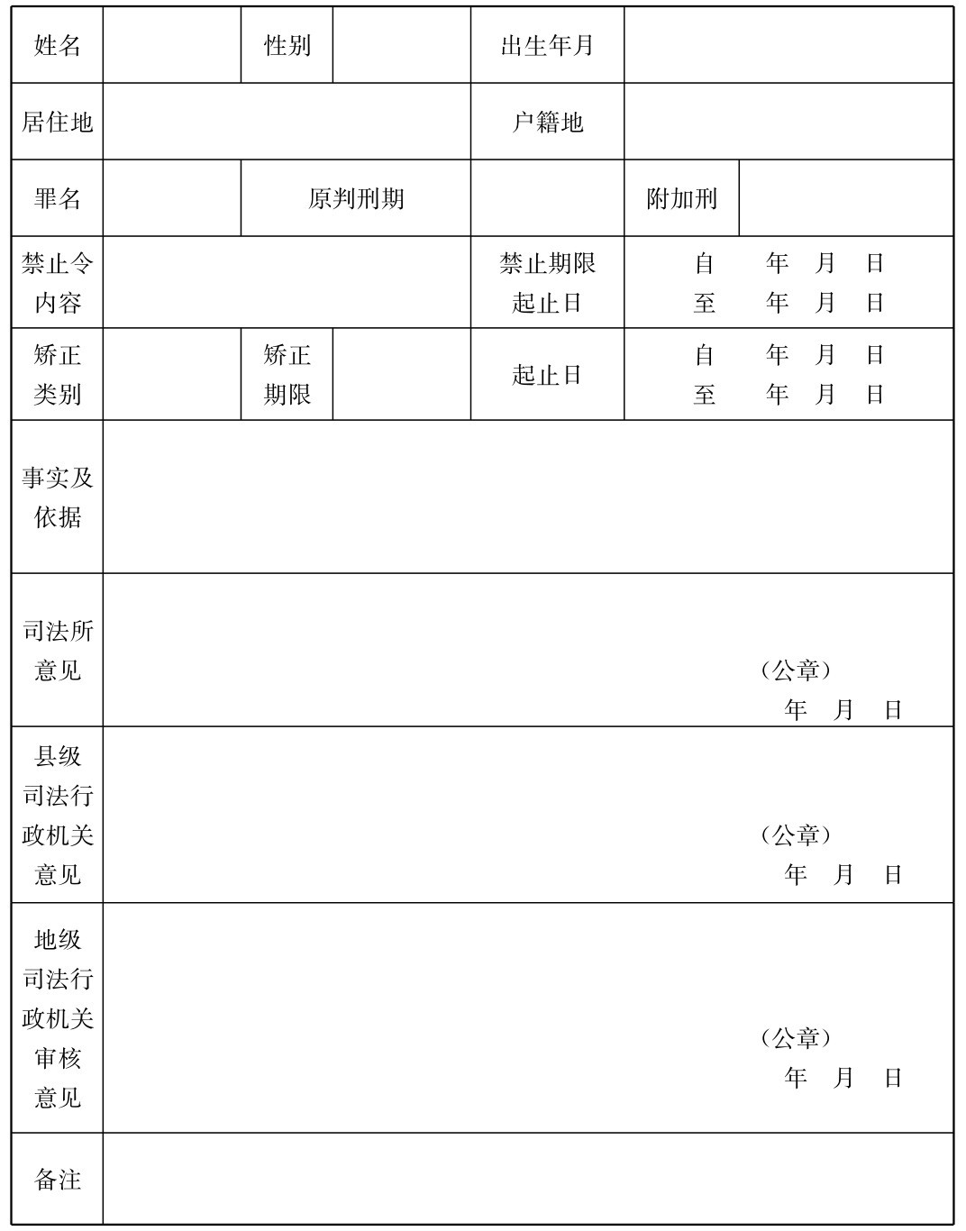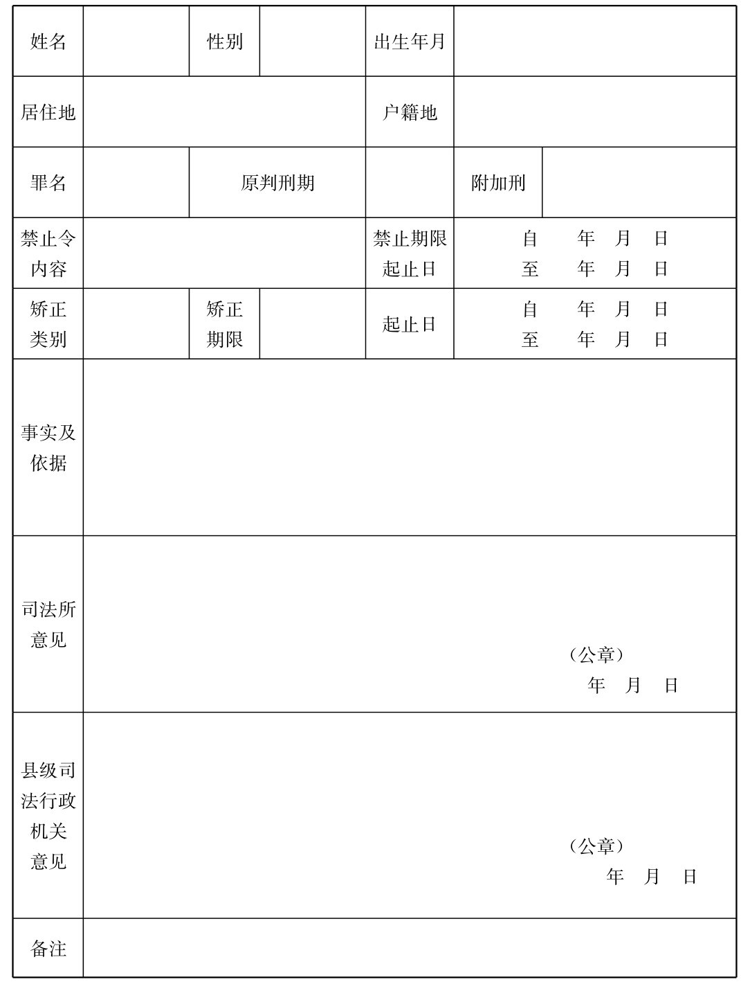 根据 《实施办法》第三十条设计。一式四联,第一联由县级司法行政机关存档,第二联送原作出裁判、决定的人民法院、公安局、监狱管理局,第三联送居住地人民检察院,第四联送居住地公安机关。A3纸打印。