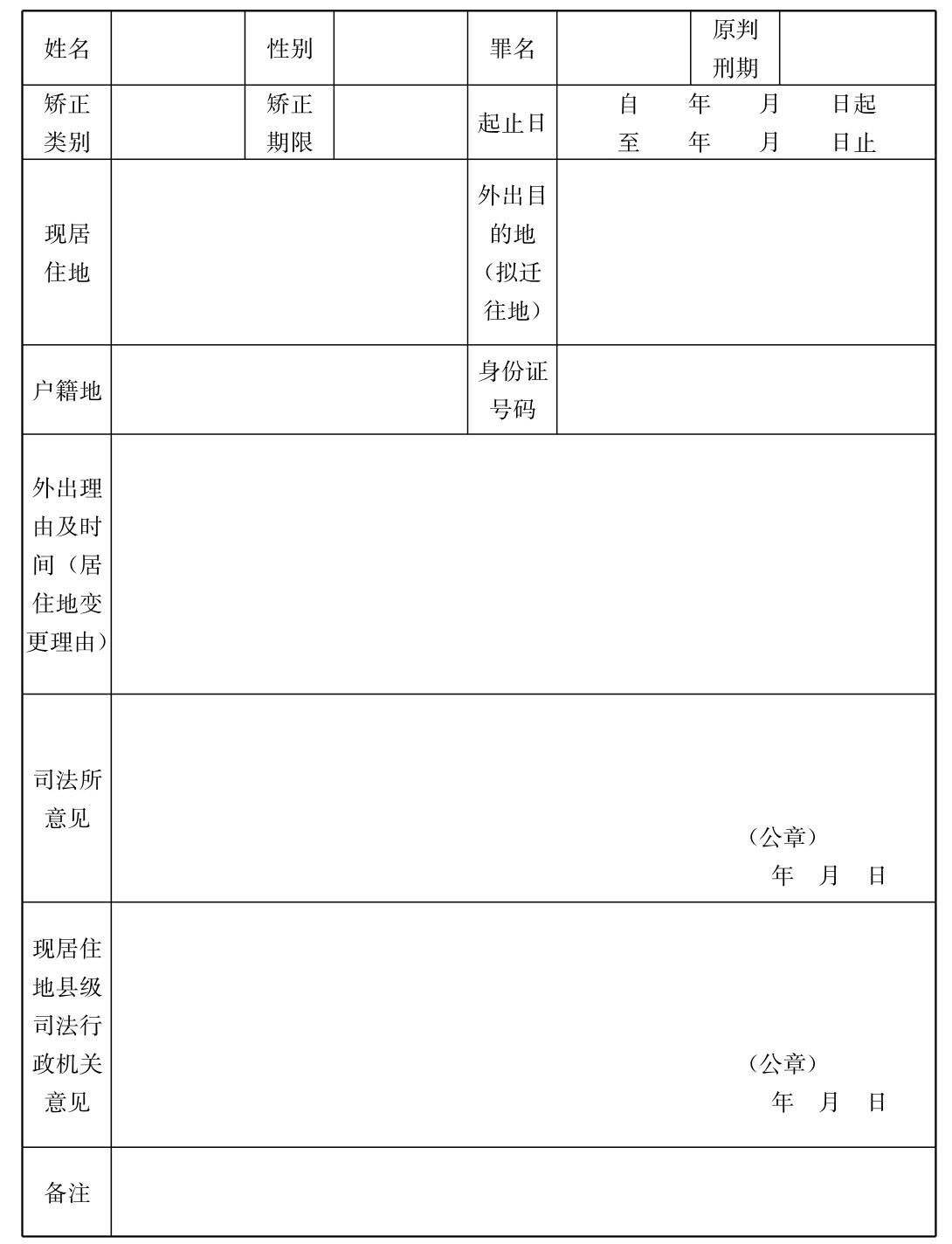 根据 《实施办法》第十二条设计。司法所填写意见后,连同社区矫正人员个人书面申请,报县级司法行政机关审批。一式三份,县级司法行政机关、司法所各存档一份,抄送居住地县级人民检察院一份。