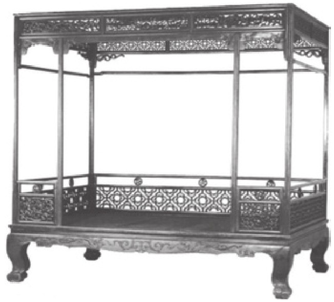 对于家具的各种围子与建筑中的各种棂格,至今难以判断哪个是源、哪个是流,我们见到的明代的大床上,已经使用了方格形的床围(图3-14)。在以后的发展中,建筑中的各种门窗棂格的变化极为多姿多彩。尤其是明清晚期,建筑门窗的棂格图案已经非常丰富。其中常见的山字纹、云纹、冰裂纹等,在家具上不仅常见,而且两者名称都是一致的(图3-15)。