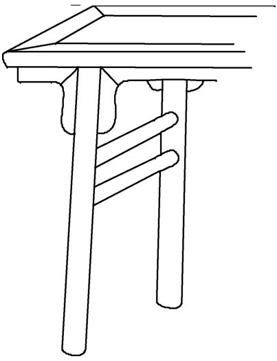 案型结体的技法是将腿柱与桌面结合的位置,由桌面边框格角的所在地向中央略为挪进,缩小腿间的距离。一般而言,腿柱底部塑出向外撇的侧脚,以及腿间以不同造型的直枨或牙条连接。此处范例中的牙条以燕尾闷榫卯合左,右瓣其实是一件式的刀子板牙头。腿柱上端出双榫,卯入边框底面所凿的榫眼,达到扣紧桌面的功能(图4-1)。