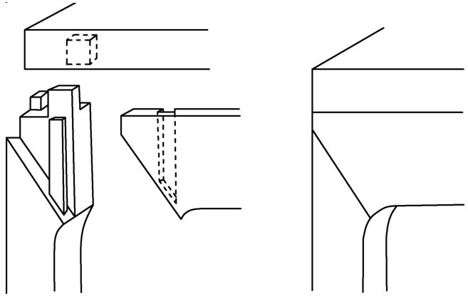 在唐代的绘画中可目睹这类箱型的桌和台座。简练的四面平形制的桌、床和凳早在宋代就已有制造,直到明代仍然持续流行。利用直平的特性,易于将数个四面平单桌平整地连接,拼成一大型宴桌。由于牙条用料在高度及厚度上大增,故四面平式桌型结体所用的榫卯,在构造上不同于有束腰桌型结体者。在桌型变体结构上,腿柱顶端部位需造出多个长榫,榫长不仅长及贯穿牙条的高度,而且还要卯入桌面(或椅盘)边框内。如图4-3所示采用的三碰肩形式,四面平桌中大边、抹头、腿三处汇成一棕角榫结构,在明、清家具中常见。四面平的形制发展可能源自早期的箱型结体。