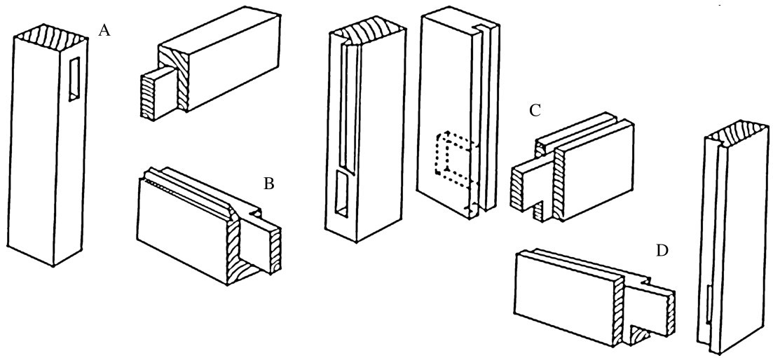 榫接最常被用于制造门及其他框架,使嵌板固定于框架上。如图4-4所示,图中A为最简单的形式,其横挡之榫头插入直梃中;B框架之内框实木上制作饰条,其端部与另一组件成斜接;C嵌入槽中嵌板之接合处,必须有半切部;D内框为方边与有凹线嵌板接合。