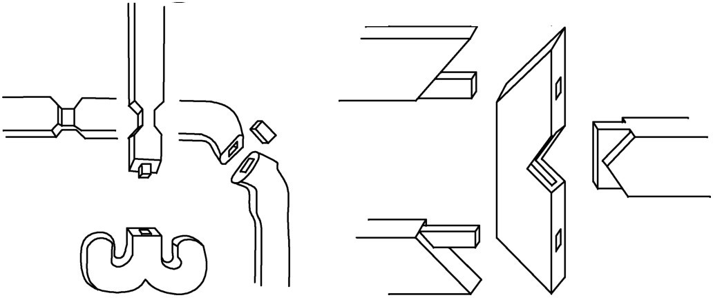 (7)弧形短材的接合。这种情况多出现在圈椅中。圈一般分为三接、五接,即用三段、五段弧形短材接合而成。圈的接合施用楔钉榫(图4-13)。