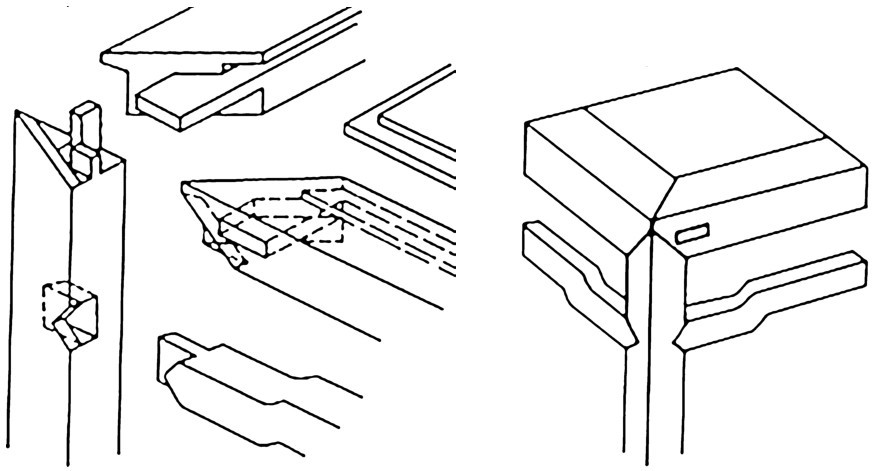 (8)格角榫攒边。明式家具中,几、案、桌、椅等的面框架部分,大多使用以45°的格角榫攒边的做法(图4-14)。它较“齐头碰”美观,大边、边抹的侧面木纹接合自然一致,各面都能看到美丽的纹理。
