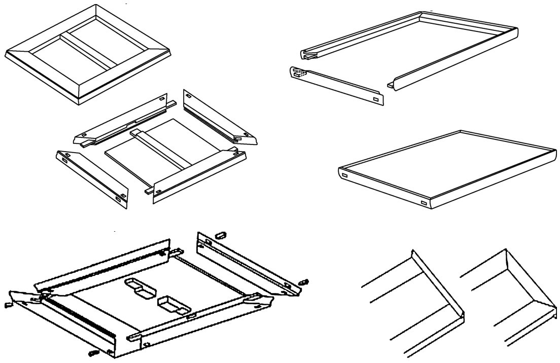 (9)攒边打槽装板。四根木框,两根长而出榫的称“大边”,两根短而凿眼的称“抹头”。在木框内打好槽,将木板“边簧”放入槽内。穿带出头的部分插入大边榫眼内。把木板装入木框的做法叫作“攒边打槽装板”(图4-15)。
