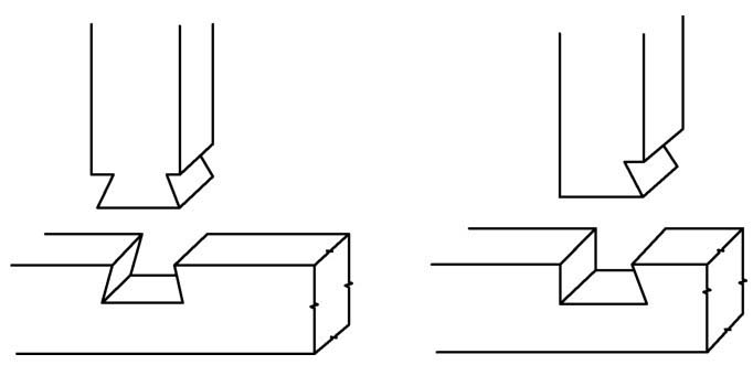 (1)多块薄平板的拼合。薄板材由窄拼宽,一般是利用龙凤榫(也叫凹凸榫)加穿带的形式。先把薄板的一边刨出断面为“凹”字形,与相邻的那块薄板的长边开出断面为“凸”字形,用榫插的办法把两块板拉拢后,再在薄板上面做一穿带。如多块板材系厚板,又被使用在不显眼的地方,则也可以用施银锭榫(燕尾榫)拼合(图4-6)。