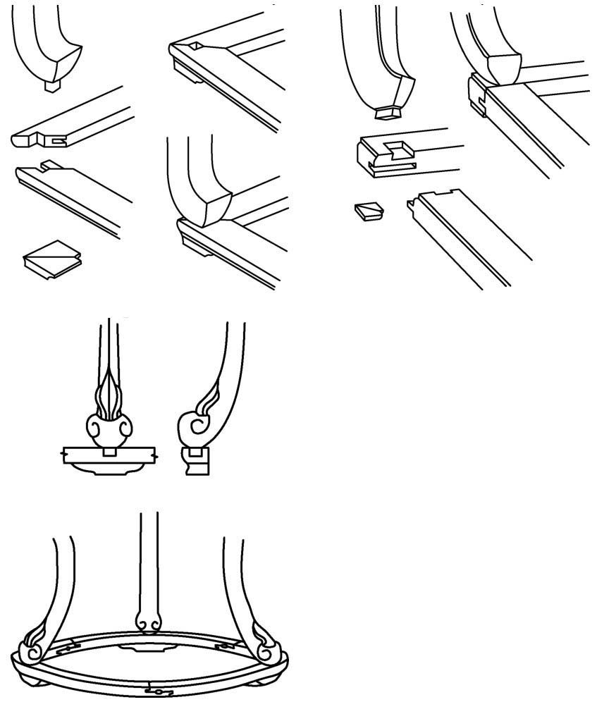 (1)腿子与托泥的接合。托泥为圆形或方形的,其做法与直、圆材交叉做法相同,如图4-28所示。