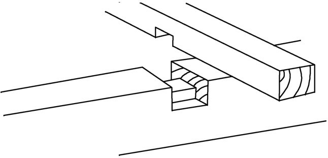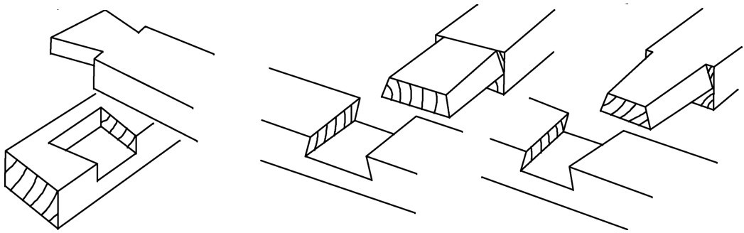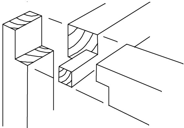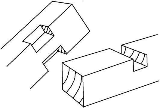(9)切槽齿榫接合。当一件十分轻巧的断面组件与一件相对十分厚重的组件交叉时,其强度与定位需要一种包含其他切削的普通搭接接合。这种情况下,厚重的组件两侧切槽而留下一窄小部分,其上较轻的组件切槽成半搭接合的方式,这是使用在建筑木工上的主要接合(图4-40)。