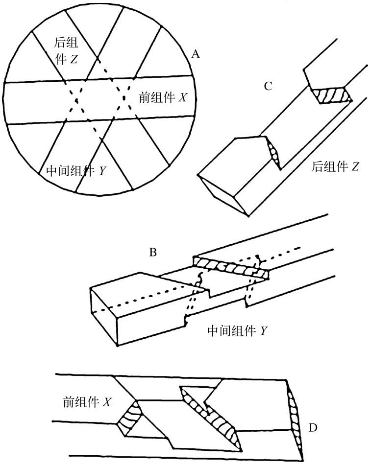 (8)三向平接(图4-39)。如果三组件成平面交叉,接合是半搭的形式,则组件被切削成三等分而非一半,其可能平均对圆周成等分安排来交叉,如同要构成轮子的轮柄,其或可为木制轮子的部分,或可用来铸金属轮木模的部分,轮柄外侧的接合应该做成所要铸成金属的外形。