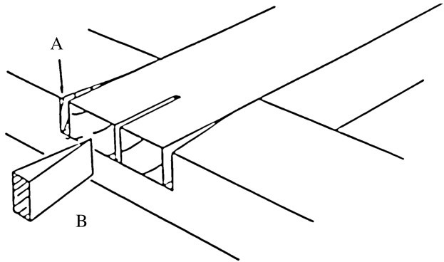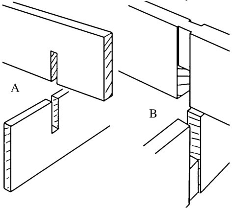 (11)带楔半搭接合。平行材面的T型半搭接合取决于胶合剂与螺钉或木钉来抵抗引拔荷重,其可在一边或两边做成鸠尾形式,但是其仍然是一种容易装配而又容易脱落的接合。如果接合采取类似于榫头楔片的方式打入楔片,则平面的半搭接合可被扩展来搭配斜锥的承口以获得最大的紧密度与承受引拔荷重(图4-42)。承口的两侧应该切削成一斜锥以承接组件的厚度A,且在另一组件锯出隙槽以承接楔片B。