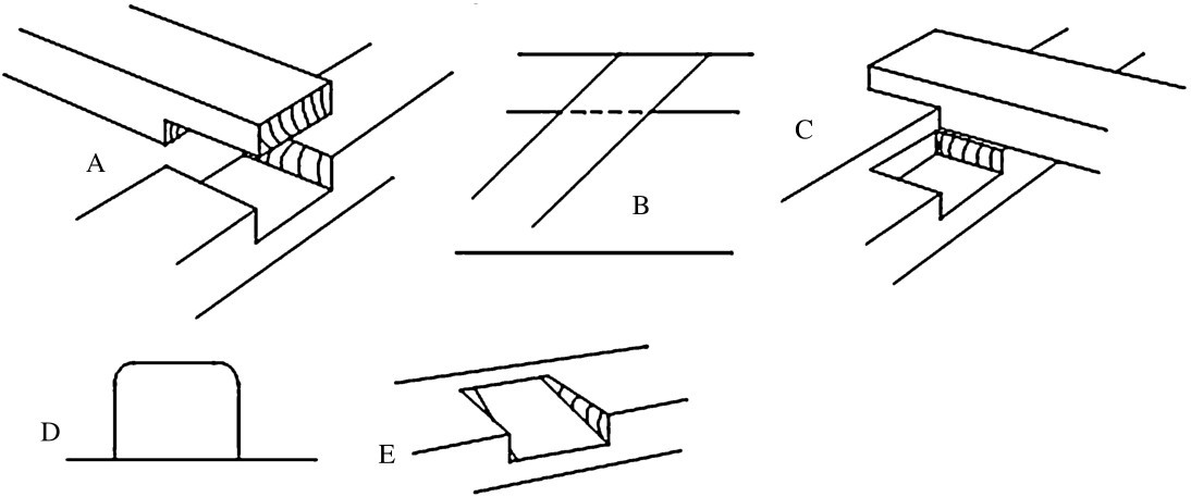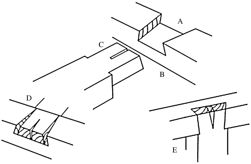 (1)T型半搭接合。在一中间木材与外侧木材交会的情形下(图4-32),将其中一件切削成与交叉半搭接合一样,而另一件则与转角接合相同(图中A),也可使用于两组件或者是当构成一搁板撑柱(图中B)。某些组合情形不让其端面木纹理外露在其材边,如此T型半搭接合可以采取不贯穿(图中C),除了其较短及端部应该锯成长度外,而不是去留一些长度以利修平,两件木材的切削可与贯穿时相同。另一组件可以用路达机挖去大部分不需要的木材,然后角落再以錾子修出直角(图中D)。组件也可用手锯来加工,然后再以錾子将边缘加工成直角,且将不需要的木材除去(图中E)。