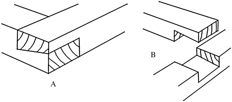 (2)钩形半搭接合。如图4-33所示,半搭接合在转角处可成钩形(图中A),或在T型接合(图中B),在交叉半搭接合成一斜面并无任何好处。T型接合若需较大的强度,其最好使用鸠尾形的半搭接合。