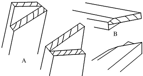 (4)斜角半搭接合。如果框架要有斜接的外观(图4-35),则半搭接合的一面可以向后切削(图中A),如此将减少胶合的接触面积,使接合强度有些弱。如果其背面以一夹板加强也就没有关系,如果内侧边缘成一简单的斜面或花边或需要这类的转角接合,则斜面或花边应安排在斜接的一面(图中B),其强度可用螺钉从背面锁进斜接的舌榫来获得。