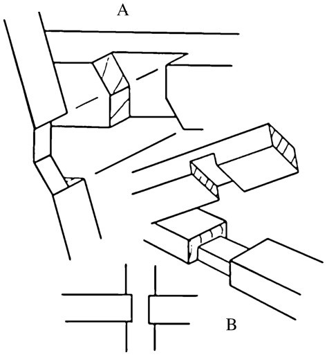 (5)束紧接合。在房屋结构上有不成直角的各种交叉半搭接合(图4-36)。一种做法是将一组件直线横穿过另一组件来装配,但是有一组件的侧面会削出向内的斜角(图中A),其角度不应太大,否则被切削的组件其强度将被削弱太多。另一种做法是承口半搭接合,将其中一组件削出榫肩缺口以便能嵌入另一组件,如同前面的例子,切削缺口应该仅是微量,否则切削的组件将被减弱强度(图中B)。