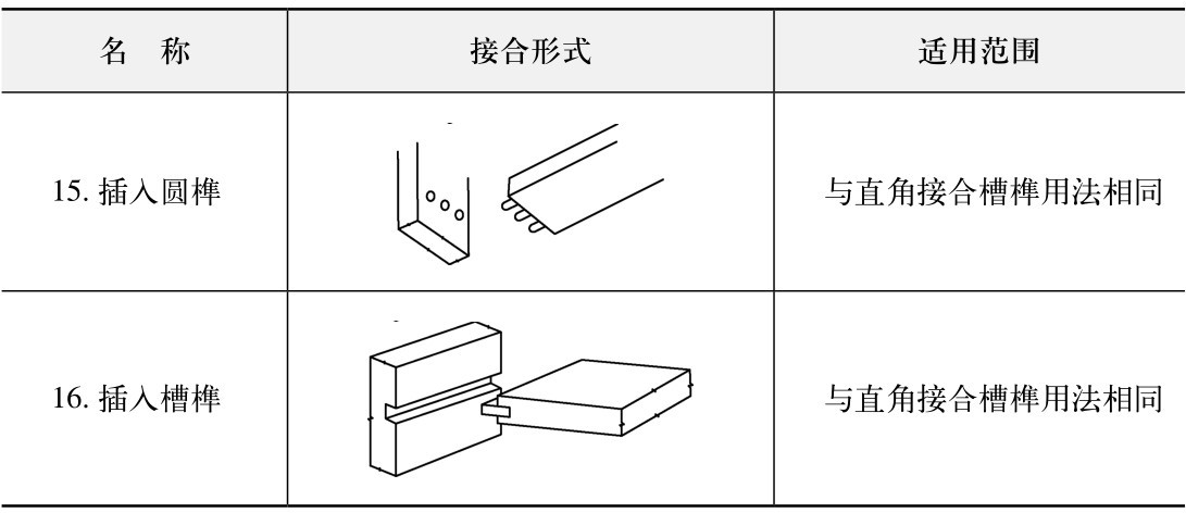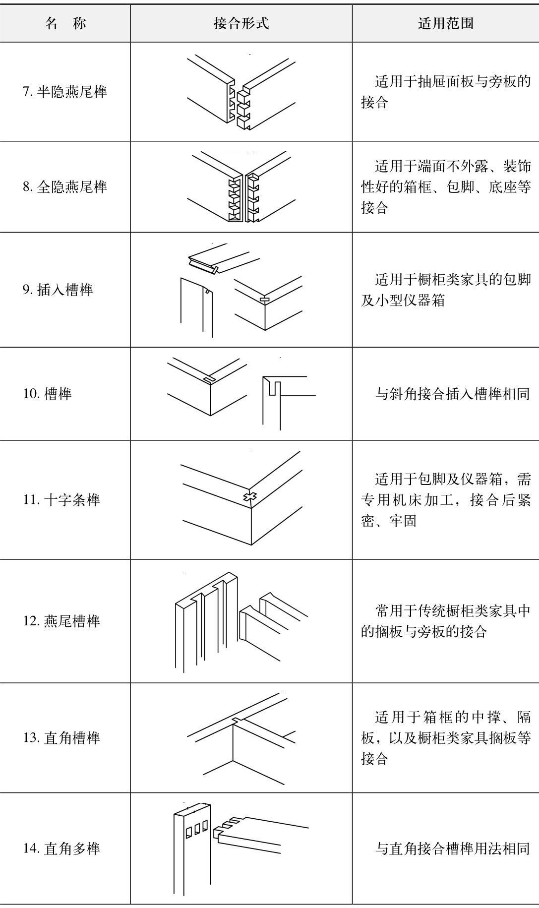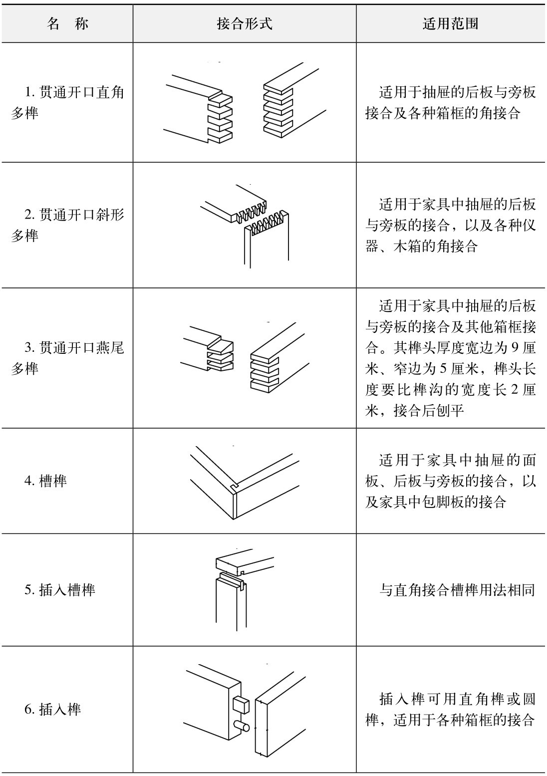 箱框是由四块以上的板材或拼板按一定的接合方式构成的,箱框的接合形式有直角接合、斜角接合和中部接合,其接合形式在框式家具中一般采用榫接合,具体情况见表4-4。