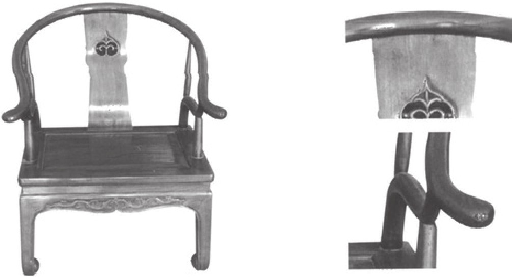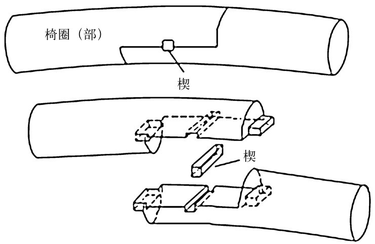 用来连接圆棍状又带弧形的家具部件,如圆形扶手的榫卯结构,这种情况多出现在圈椅(图4-75)的扶手、圆形家具中。圈一般分为三接、五接,即用三块、五块弧形短材组合而成。两根圆棍各去一半,做手掌式的搭接,每半片榫头的前端都有一个台阶状的小直榫,插入另一根圆棍上的凹槽中,这样便可使连接部不能上下移动。然后在连接部的中间位置凿一个一端略大的方孔,再做一个与此等大的四棱台形长木楔,将一枚断面为方形,一边稍粗、一边稍细的楔钉(图4-76)贯穿过去,便能保证两个小直榫不会前后左右脱出。