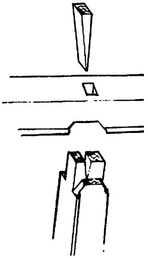 大进小出楔是在半楔的基础上,用较壮而规整的木楔穿透家具表层将半榫备牢,省工省料,既美观又坚固(图4-83)。这种楔一般用在两层材料不一致的家具之上,也可在断损的榫的修复上使用。