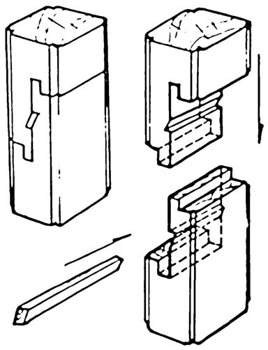 “钉”,是指竹钉,不是铁钉。在中国古典家具中,除西北干燥地区偶见用铁钉外,其他地区极少以铁为钉。用铁钉是中国古典家具工艺之大忌。竹钉断面多为圆形,间或也有方形。“销”,是指两顺向木材间用于管束其相关位置的小木块,管而不死,可拆卸活动(图4-91)。