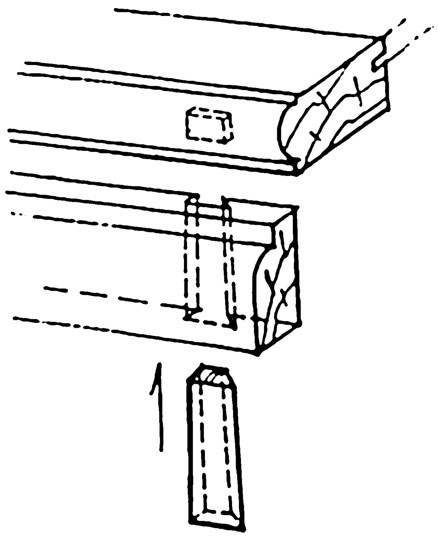 穿销是在栽销的基础上延长其一端,使其贯穿于牙板的内侧,一般穿销通常有梯形的角度,边沿有燕尾形的榫口,可在增加部件强度的同时,管束其干缩湿胀的方向,使两木永远贴紧(图4-93)。