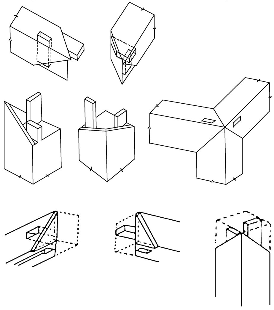 因其外形像粽子角而得名,从三面看都集中到角线的是45°的斜线,又叫“三角齐尖”。多用于框形的连接。另外,明式家具中还有“四平式”桌,其腿足、牙条、面板的连接均要用粽角榫(图4-96)。