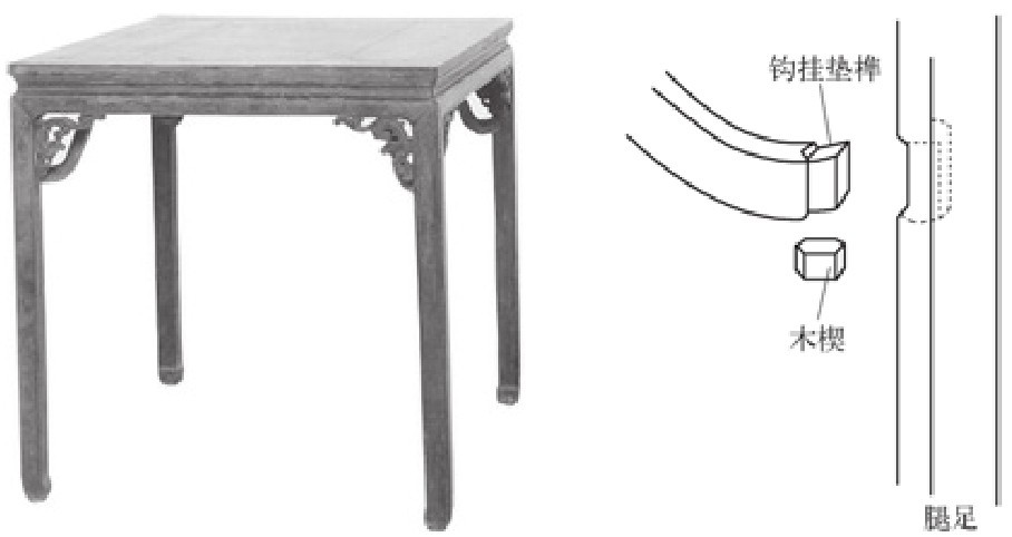 榫眼做成直角梯台形,榫头也做成相应的直角梯台形,但榫头的下底面等于榫眼的底面,嵌入后斜面与斜面接合,产生倒钩作用。然后用楔形料填入榫眼的空隙处,再也不易脱出,故曰“钩挂榫”(图4-98)。