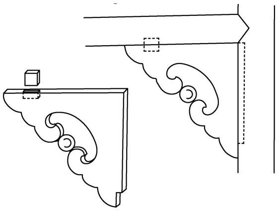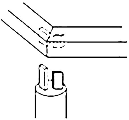 一般腿部与面子的边抹接合时,腿料出榫做成一长一短互相垂直的两个榫头,分别与边抹的榫眼接合,故称“长短榫”(图4-102)。因边抹接合用格角榫,抹头两边从打榫眼腿料出榫与大边出榫相碰,故只有长短榫才能牢固。