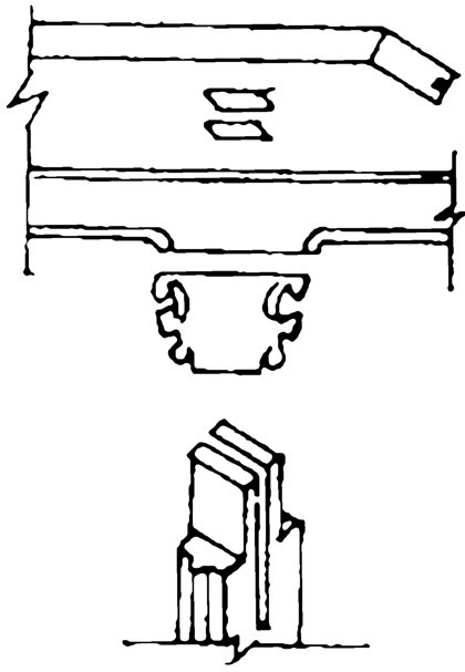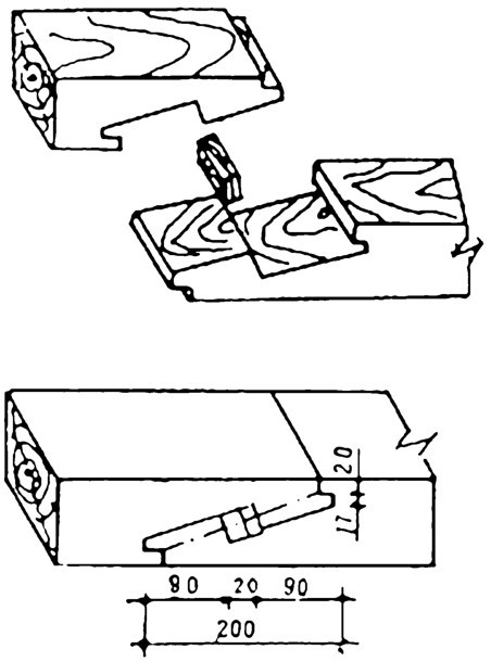 采用此种搭接的构件既能够承受压力,又能承受拉力。画线方法为:在斜面两端各画一边长为20毫米的小方格,把两方格的里角连起来作斜轴线。轴线左右各画一细线,细线距轴线17毫米,在斜轴线中间留出20毫米的楔口,照楔口线锯出楔口。组合时,把两构件由侧面装插,中间楔木销即可牢固(图4-105)。