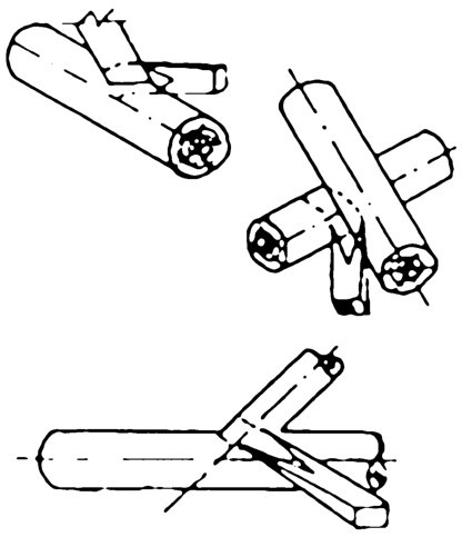 (2)不规则的圆木相交。不规则的圆木相交,用拖签画线法。签是用薄木片或竹片制成的,前端削成燕尾或尾尖。画线方法是:将一个尾尖蘸上墨水,贴靠榫头肩部,将另一尾尖紧靠榫眼边沿,由下而上,再由上而下,在榫肩处拖画出一条曲线,这条曲线就是榫肩曲线(图4-107)。