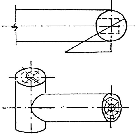 (1)同直径相交。同直径垂直相接合,应遵守的规则是:榫头圆木的榫肩起点必在榫孔圆木的半径上,用圆规量取做孔圆木的半径,把一规脚扎入榫头圆木侧面线,就可画出榫头的落肩线(图4-106)。