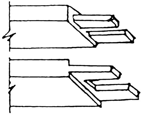 两分榫,又叫“装夹口榫”,就是将宽榫分为三份,两份做榫,一份做夹口榫。装榫的深度一般为10毫米,有的需批榫,把榫头分四份,两份做榫,一份做夹口榫,另一份批掉,以各受剪力(图4-121)。