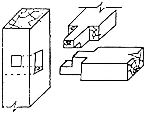 榫和孔在同一水平位置上交接时,每个榫头必须做出大小榫,即每个榫头有1/2长榫或短榫,长榫是透榫,短榫是半榫,形成榫根大、出头小,所以叫“大进小出”(图4-122)。