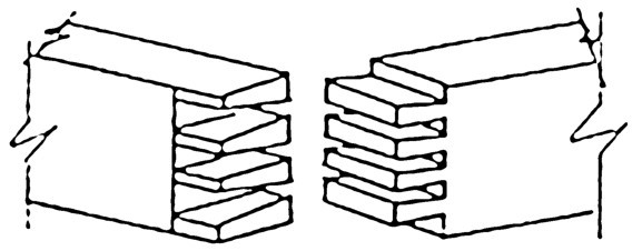 马牙榫,主要用于薄板框的连接。顾名思义为马牙状的榫头,一般密集排列,凹进的叫“母榫”,凸出的叫“公榫”,公榫和母榫要逐个对应好接合(图4-127)。