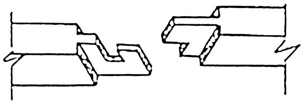 钩头榫,又叫“销榫”,两榫头相交处,一方要做出钩头。这种榫比一般的搭榫更牢固,但组装时容易崩裂,用木纹杂乱木或硬质木制为宜(4-129)。