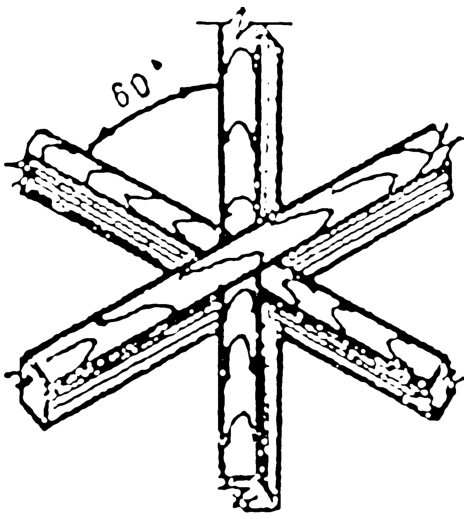 此榫为三根方木料互相倾斜成60°角接合而成,每根方木料都用锯割批去2/3厚度。画线时应先放地线,然后照地线画线、组装(图4-132)。