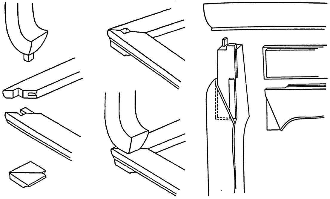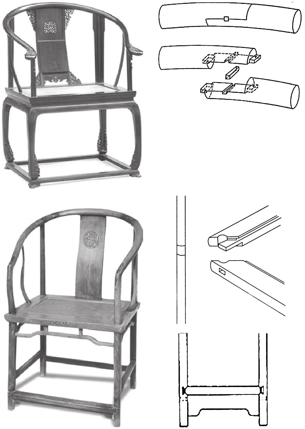 圈椅有多少种榫卯结构,要视交椅、圈椅的造型来定。最为讲究的是圈椅罗圈用楔钉榫接合,下裙板条角接合(嵌夹式),椅子前足和后足穿过椅盘的榫卯结构等(图5-2、图5-3)。