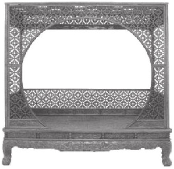 还有一种床叫拔步床,其结构带有明显模仿木作建筑的痕迹,是传统家具之中的屋中之屋。首先,从平面布局看,拔步床的前部为廊庑,后部为床榻,与传统建筑的“前室后寝”的经典布局方式有异曲同工之妙。其次,从细部结构看,拔步床与木作建筑有许多相似的结构。拔步床前端,望柱左右相对,楣板高悬,模拟的就是院落大门。而拔步床的窗棂、顶棚实则就是木作建筑窗户、天花的小型化。至于花罩,本是传统中式房屋内部装饰的常见隔断方式,拔步床不仅借用了这一手法,还在有限的空间内将花罩层层相加,创造了浓烈的装饰效果。